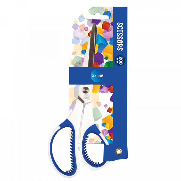 Ножницы Centrum универсальные. Предназначены для работы с тканью, бумагой, картоном, пленкой и другими материалами. Подойдут для офисного, школьного и домашнего использования. Лезвия ножниц изготовлены из нержавеющей стали. Пластиковые ручки анатомической формы имеют каучуковые вставки, которые предотвращают скольжение пальцев и обеспечивают комфортную и безопасную работу с материалом любой плотности. Длина – 20 см. Цвета - ассорти. Упаковка - картонная подложка с европодвесом.