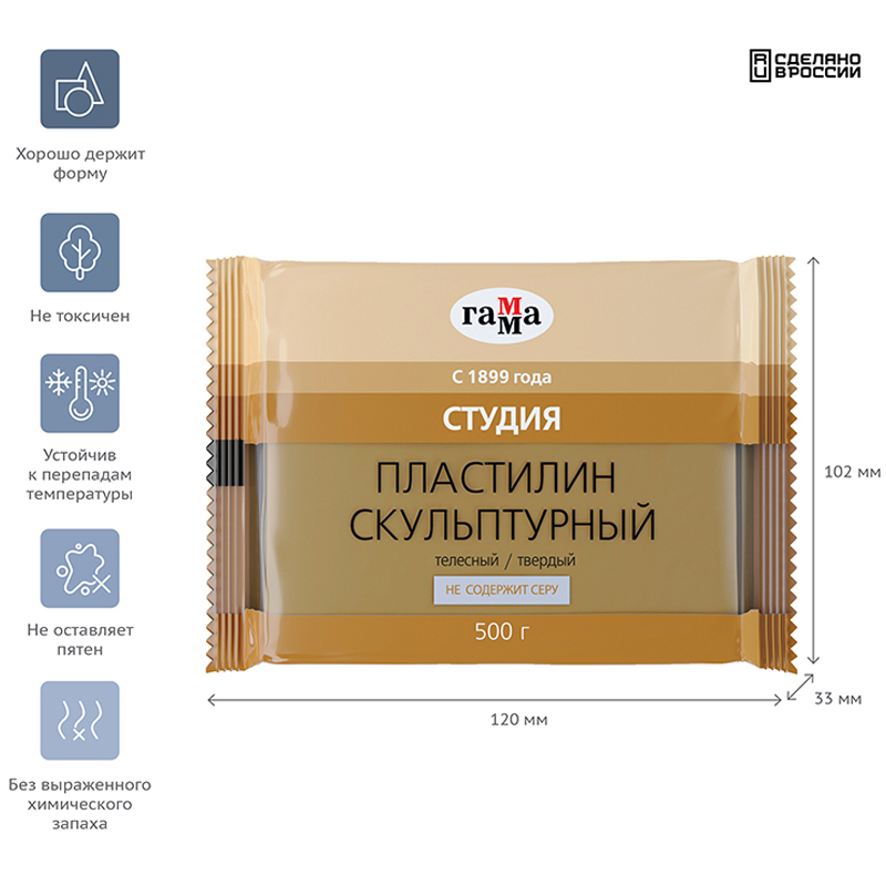 Скульптурный твёрдый пластилин ГАММА серии «Студия» телесного цвета. Прекрасно держит форму и устойчив к перепадам температуры, не оставляет пятен и не липнет к рукам. Не токсичен: не содержит серу, без выраженного химического запаха. Скульптурный пластилин ГАММА помещён в вакуумную упаковку. Вес бруска — 500 г.Твёрдый скульптурный пластилин ГАММА серии «Студия» подходит для профессиональных скульптур и макетов, его можно использовать в качестве формовочной моделирующей массы для гипсовых элементов. Оптимальное для работы скульпторов соотношение мягкости и твёрдости материала, хорошая пластичность и естественные цвета. Срок годности пластилина не ограничен