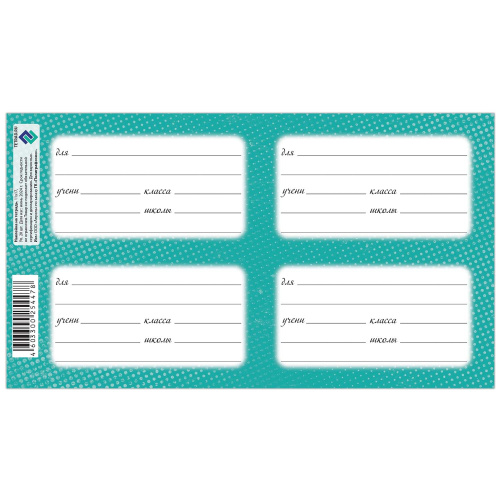 Такие самоклеящиеся наклейки позволят сделать из любой тетради предметную и покупатель всегда может определить сам, какая она у него будет. Эти наклейки можно использовать и для файлов и папок для контрольных работ. А в общих толстых тетрадях наклейка послужит, как разделитель школьных предметов. На одном листе расположено 4 наклейки. Материал: бумага на самоклеящейся основе, печать 4+0, отделка выборочный УФ лак. На одном листе расположено 4 наклейки. У каждой наклейки есть вырубка под европодвес. Наклейки упакованы по 20штук в прозрачный пакет с европодвесом.